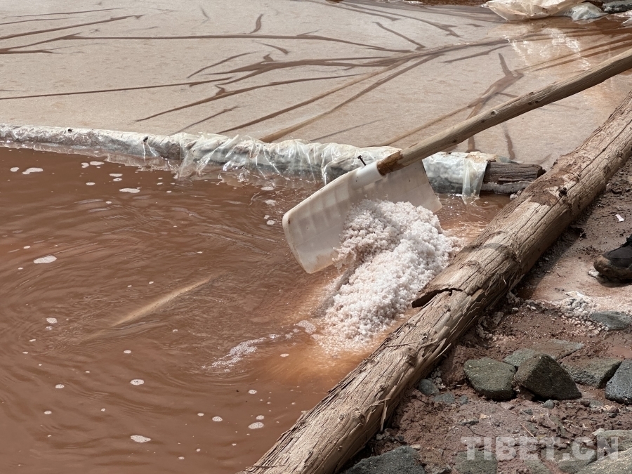 白扎鹽場出產(chǎn)的鹽有白鹽與紅鹽兩種,圖為江羊巴桑正在向我們展示白鹽的制取過程??梢钥吹剑M管鹵水呈現(xiàn)較深的紅褐色,但初步制取的鹽仍然呈現(xiàn)雪白的顏色。攝影:畢然