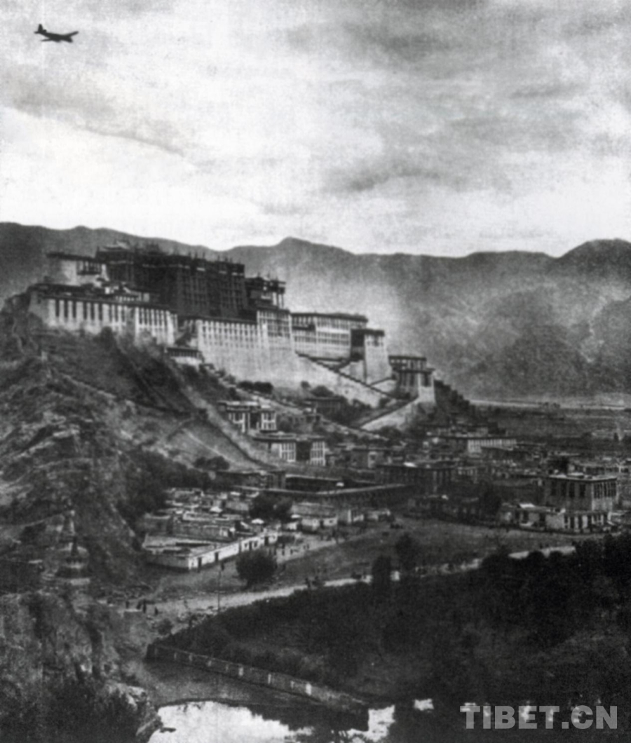 歷史照片:西藏民航飛機飛過布達拉宮。民航西藏自治區(qū)管理局供圖