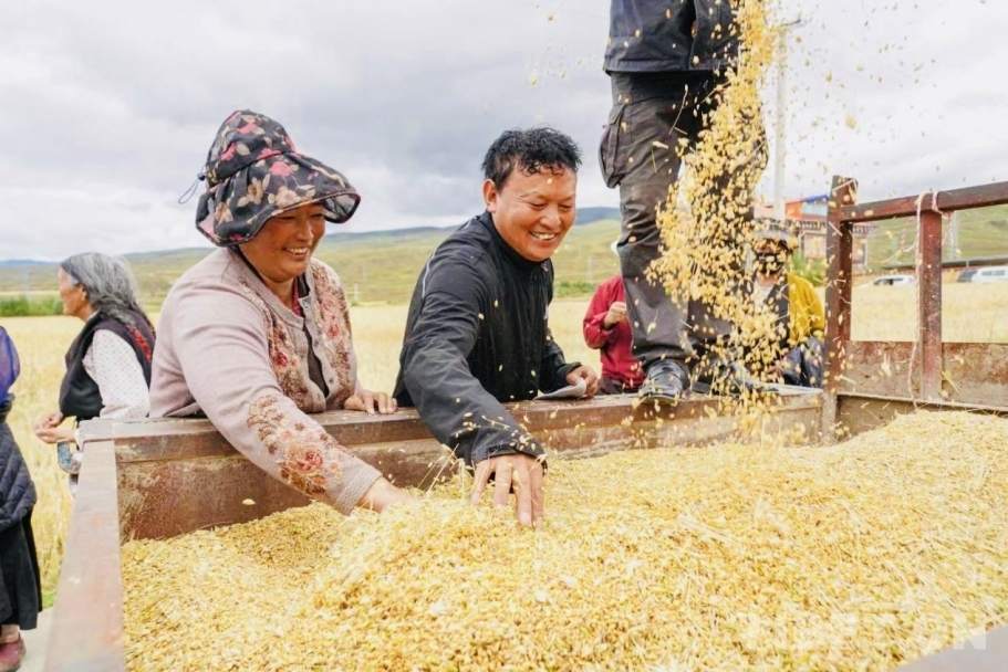 中國西藏網(wǎng)訊 8月29日,四川省甘孜藏族自治州甘孜縣拖壩鄉(xiāng)拖壩四村的500畝青稞基地里,收割機轟鳴作響,飽滿的青稞穗被整齊收割。甘孜縣12萬畝青稞陸續(xù)成熟,高原上一片金黃。據(jù)甘孜縣農(nóng)牧農(nóng)村和科技局?jǐn)?shù)據(jù)顯示,今年全縣青稞預(yù)計總產(chǎn)量達27805噸,較去年增長4.9%,再創(chuàng)歷史新高。