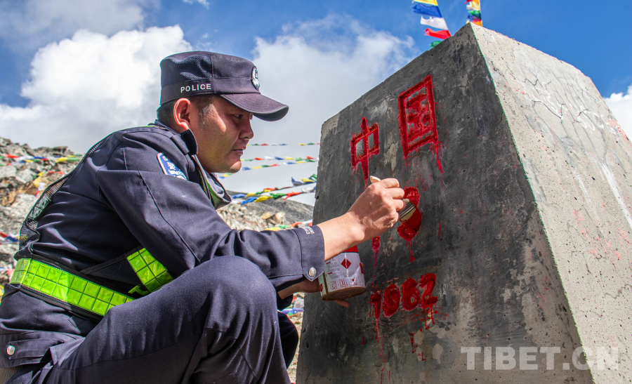 圖為日喀則邊境管理支隊(duì)霍爾巴邊境派出所民警為紀(jì)念中國(guó)人民抗日戰(zhàn)爭(zhēng)暨世界反法西斯戰(zhàn)爭(zhēng)勝利80周年開(kāi)展界碑描紅 攝影:楊承旭