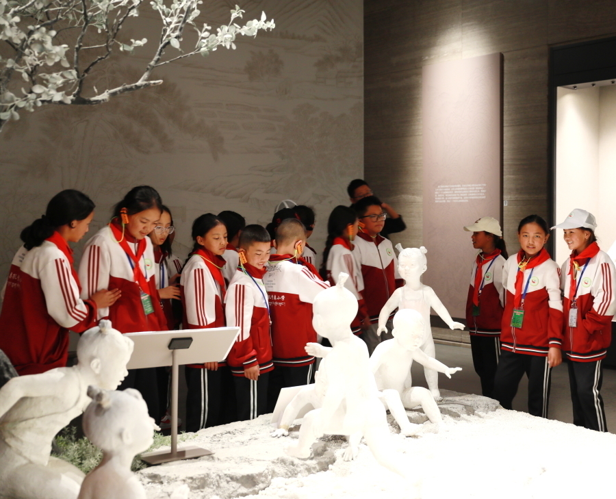 圖為《風(fēng)乎舞雩》群像塑像前,孩子們體悟千年前對于百姓富足、社會安定的理想追求 攝影:劉莉