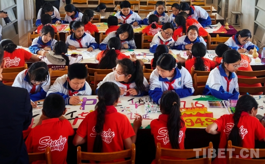 圖為西藏、山東小朋友共同繪制迎國慶主題長卷 攝影:劉莉