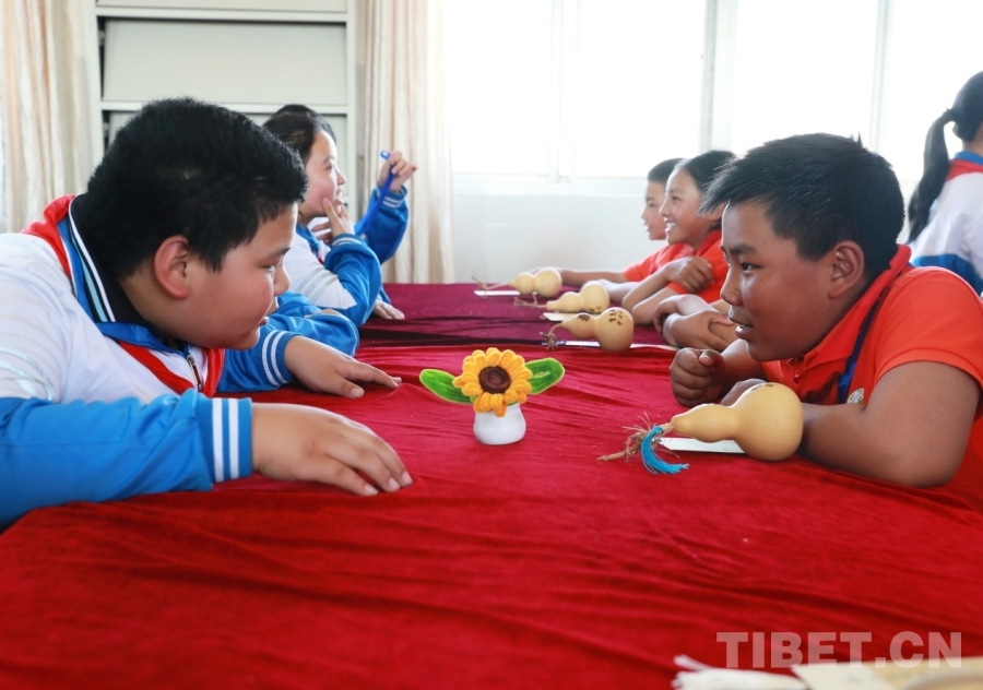 圖為山東聊城堂邑鎮(zhèn)中心小學(xué)學(xué)生向西藏阿里噶爾縣孔繁森小學(xué)的小伙伴贈(zèng)送并介紹媽媽親手制作的向日葵小擺件 攝影:劉莉