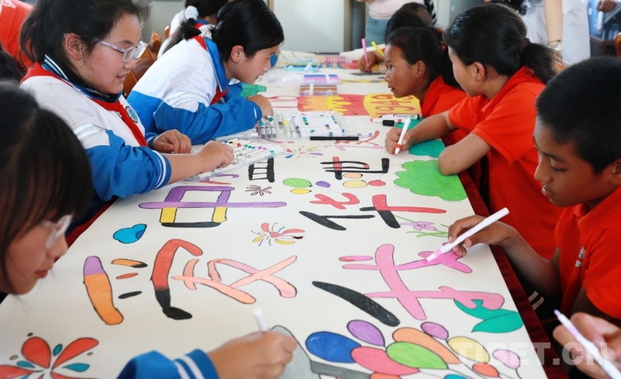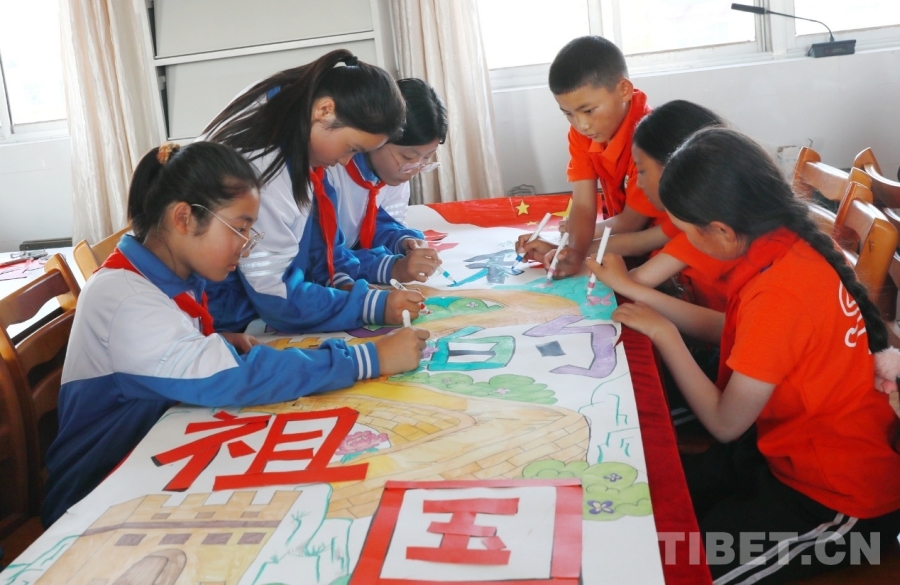 圖為西藏阿里噶爾縣孔繁森小學(xué)、山東聊城堂邑鎮(zhèn)中心小學(xué)的孩子們共同創(chuàng)作迎國(guó)慶主題畫(huà)卷 攝影:劉莉