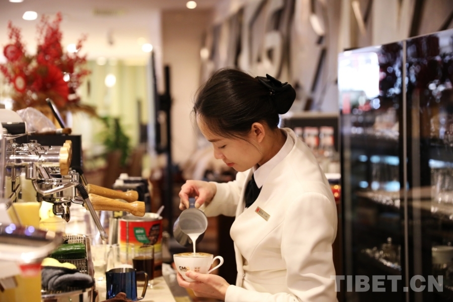 2026年全國(guó)兩會(huì)新聞中心茶歇處飲品吧工作人員正在為咖啡拉花 攝影:劉莉