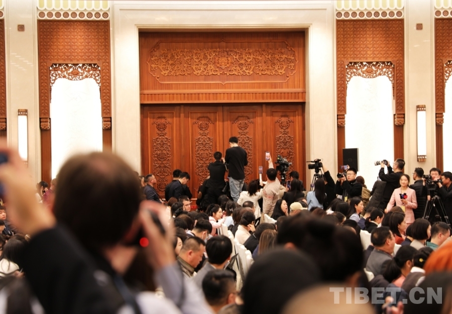 3月3日下午,全國(guó)政協(xié)十四屆四次會(huì)議新聞發(fā)布會(huì)開始前,記者們對(duì)準(zhǔn)大會(huì)新聞發(fā)言人劉結(jié)一即將進(jìn)入的新聞發(fā)布廳大門。攝影:劉莉