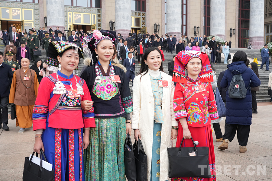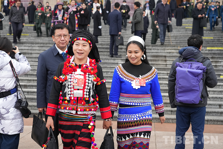 中國西藏網訊 3月5日上午,十四屆全國人大四次會議在人民大會堂開幕。開幕會后,身著民族服飾的人大代表們信心滿懷走出會場。(中國西藏網 記者/邊子捷 劉莉)