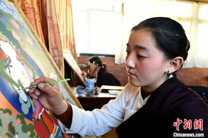 圖為1月13日,在阿壩縣“特果”唐卡藝術(shù)傳習(xí)基地二樓的畫室里,“00后”唐卡畫師更姐正在繪制唐卡。中新社記者 安源 攝