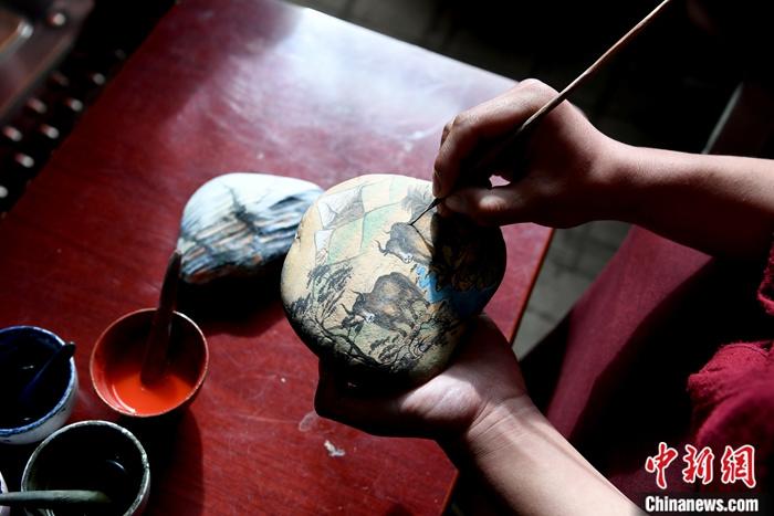 圖為1月13日,唐卡畫師在一塊石頭上繪制以“高原之舟”牦牛為主題的唐卡。中新社記者 安源 攝