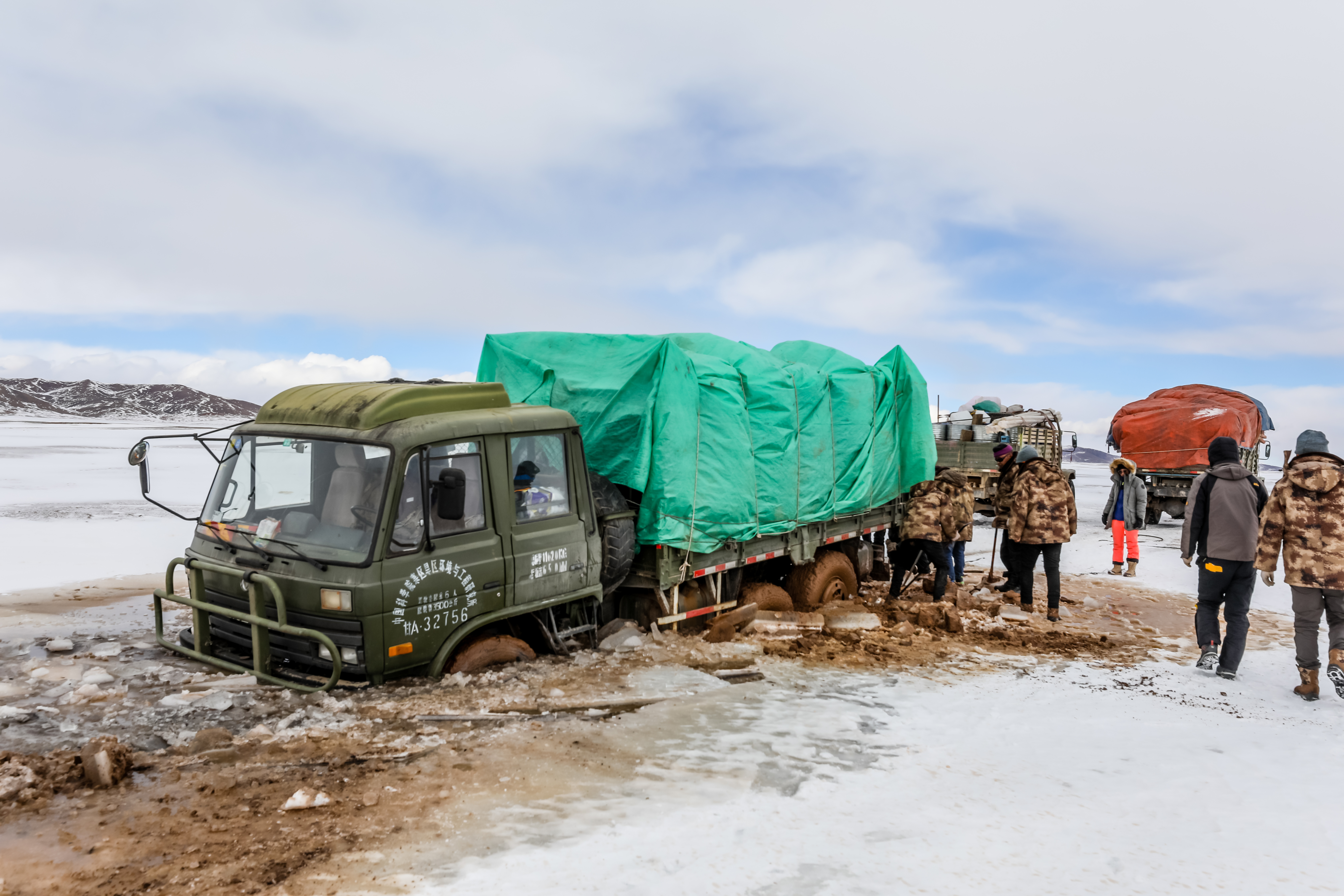 最后一次陷車(chē)臨近山的埡口,大雪掩蓋了尚未冰封凍實(shí)的小池塘。小型越野車(chē)通過(guò)后,大卡車(chē)順著車(chē)轍前行,深陷池塘。此時(shí)天已擦黑,狂風(fēng)呼嘯,科研人員只好把卡車(chē)上4噸的物品全部卸下,將車(chē)拖出,再進(jìn)行裝車(chē)?!傲阆率畮讛z氏度,5級(jí)風(fēng)的情況下,我們?cè)谀抢镎垓v了4個(gè)小時(shí)。”