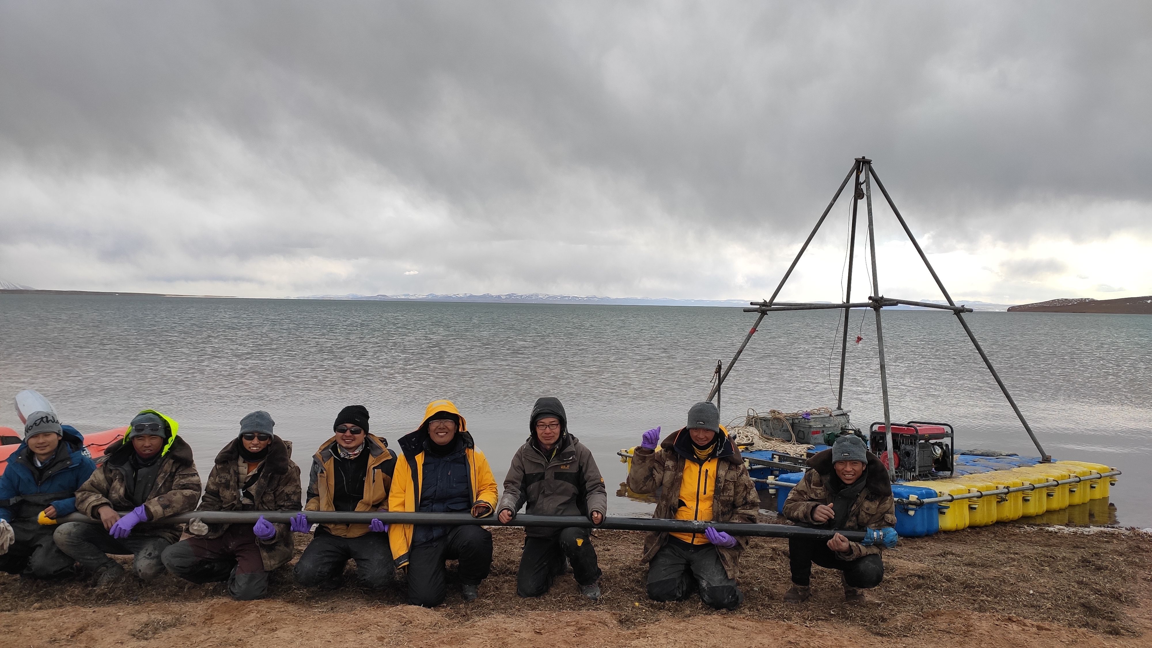 鉆取湖泊巖芯是個(gè)“力氣活”,隊(duì)員們需要協(xié)同完成下鉆、錘擊、提鉆、封管的工作??瓶既藛T用浮筒組成20平方米的采樣平臺(tái),拋錨穩(wěn)定后將取樣管觸到湖底,通過(guò)重錘擊打使沉積物樣本進(jìn)入管中,再將重重的取樣管提起。
