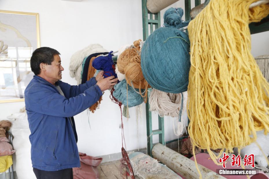 在青海省湟中縣加牙村加牙藏族織毯技藝傳習(xí)所內(nèi),青海加牙藏毯第七代傳人楊永良在織房?jī)?nèi)整理已染好色的羊毛線。中新社記者 馬銘言 攝