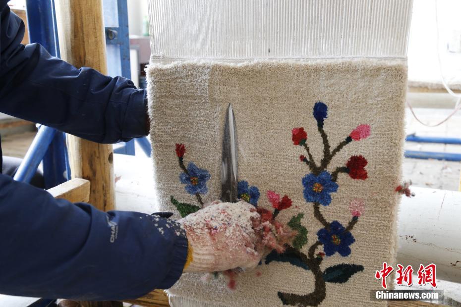 加牙藏毯第七代傳人楊永良利用剪刀對(duì)編織好的藏毯進(jìn)行精加工。中新社記者 馬銘言 攝