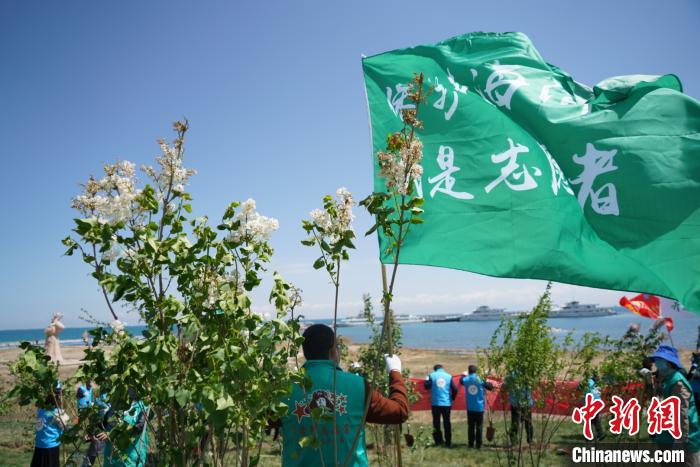 22日上午,200余名志愿者們在青海湖畔種植了丁香、榆葉梅和水栒子等適應(yīng)青藏高原高寒氣候的耐寒、耐鹽堿樹種共300多棵。