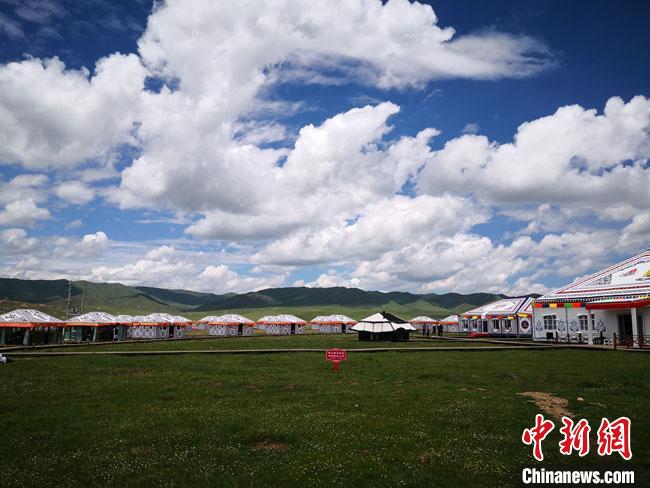6月下旬,甘肅甘南藏族自治州碌曲縣尕海鎮(zhèn)境內(nèi)晴空萬(wàn)里,湛藍(lán)的天空如同水洗過(guò)般通透明亮,輕薄如棉的云朵隨風(fēng)移動(dòng)。被一碧萬(wàn)頃的草原簇?fù)碇逆匦愦?,滿目皆是古老藏飾風(fēng)格與現(xiàn)代時(shí)尚的交織融合,吸引絡(luò)繹不絕的游人前來(lái)體驗(yàn)“高原秘境”。