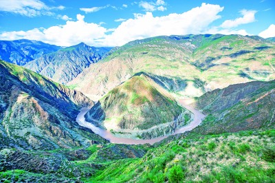 金沙江大拐彎也叫月亮灣,位于云南省德欽縣奔子欄鎮(zhèn)和四川省得榮縣瓦卡鎮(zhèn)交界處,是世界自然遺產(chǎn)“三江并流”區(qū)域的標(biāo)志性景觀之一。徐譚 攝