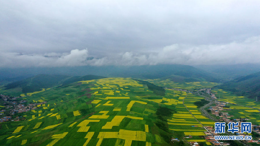 這是7月22日拍攝的門源回族自治縣境內的油菜花田(無人機照片)。新華社記者 吳剛 攝