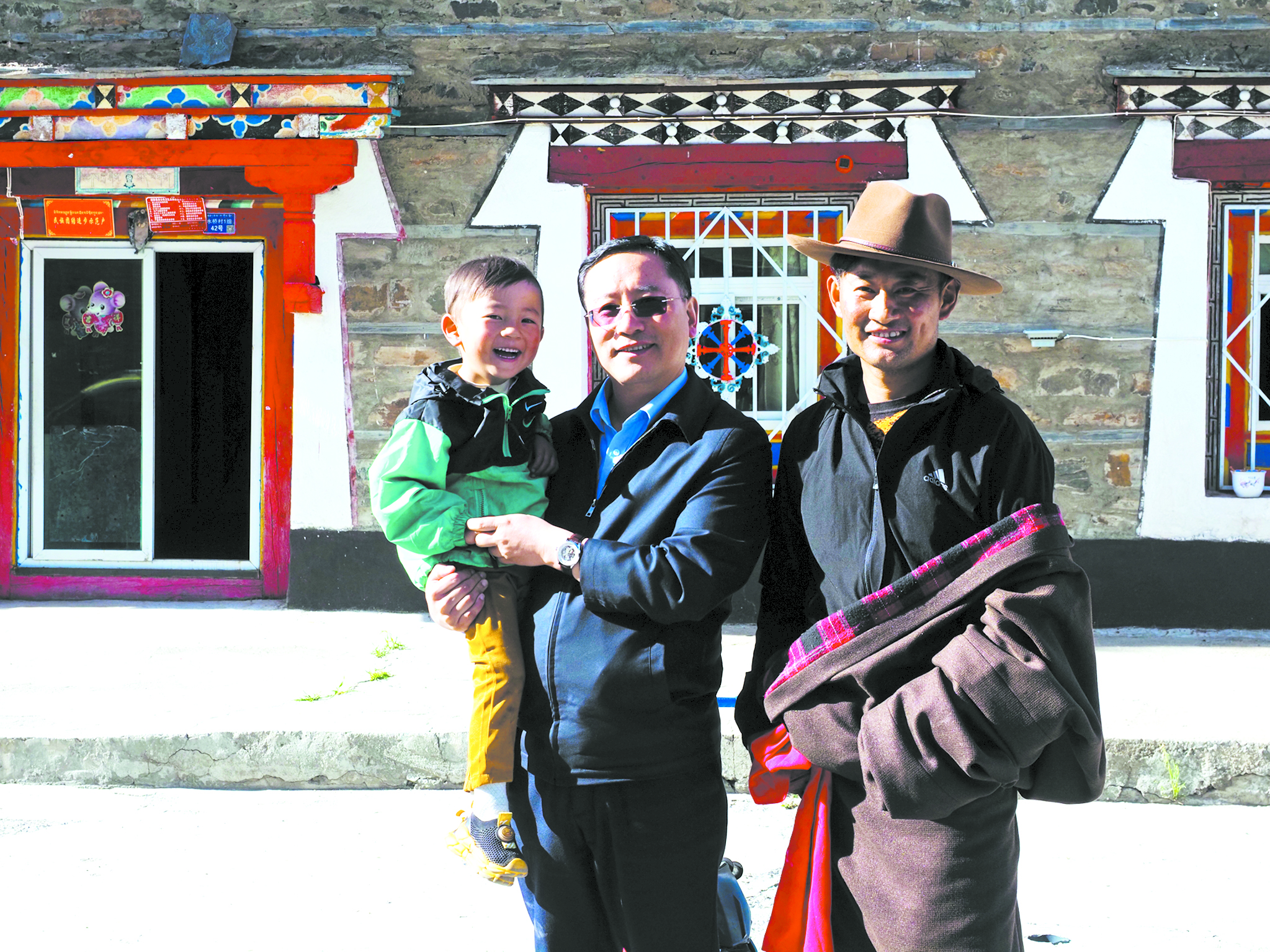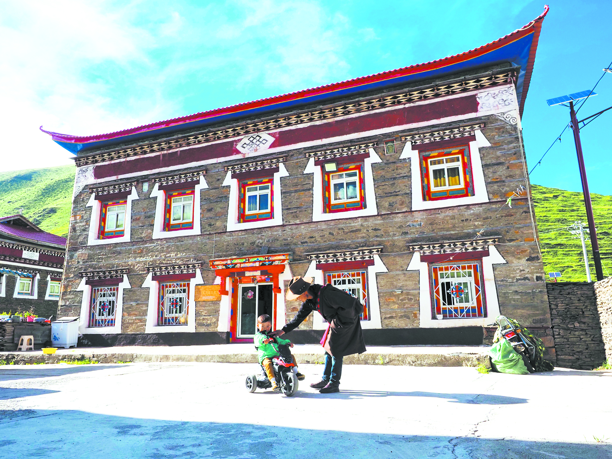 丁真汪秋陪兒子在自家改造的民居前玩耍。于譚陽 攝