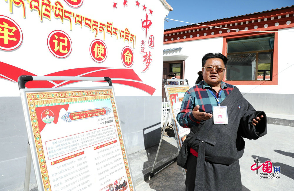 瑪沁縣拉加鎮(zhèn)贊根村的工作人員介紹專項工作組的情況。攝影:孫磊