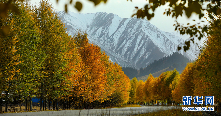 金黃色的樹木與遠(yuǎn)山交相輝映,處處呈現(xiàn)出醉人的美景。新華網(wǎng) 蘇金元 攝