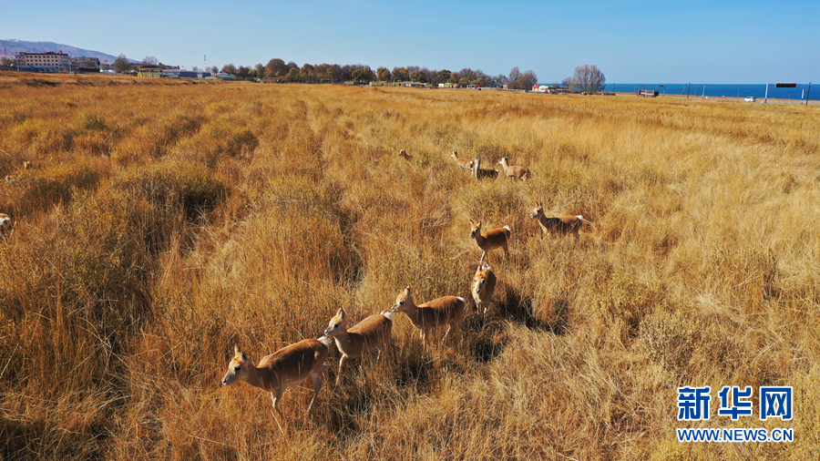 深秋時(shí)節(jié)的青海湖,芳草萋萋,遍地金黃。漫步在湖畔草原上的普氏原羚,幾乎與金黃的牧草融為一體。它們時(shí)而跳躍、時(shí)而奔走,就像湖邊一群群舞動(dòng)的精靈。
