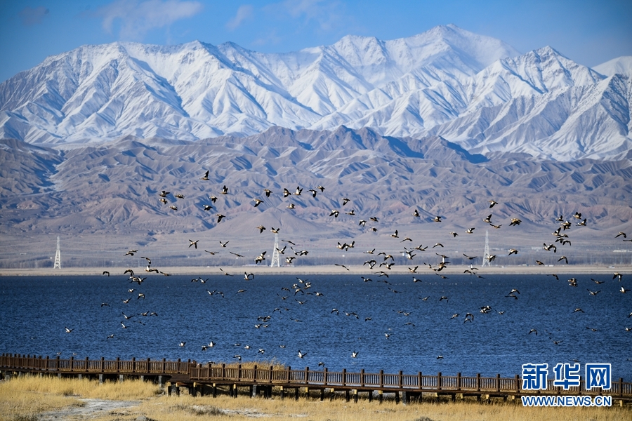 天光云影,百鳥翔集,一群赤麻鴨在都蘭湖國家濕地公園上空飛翔。(11月21日攝)新華網(wǎng) 潘彬彬 攝