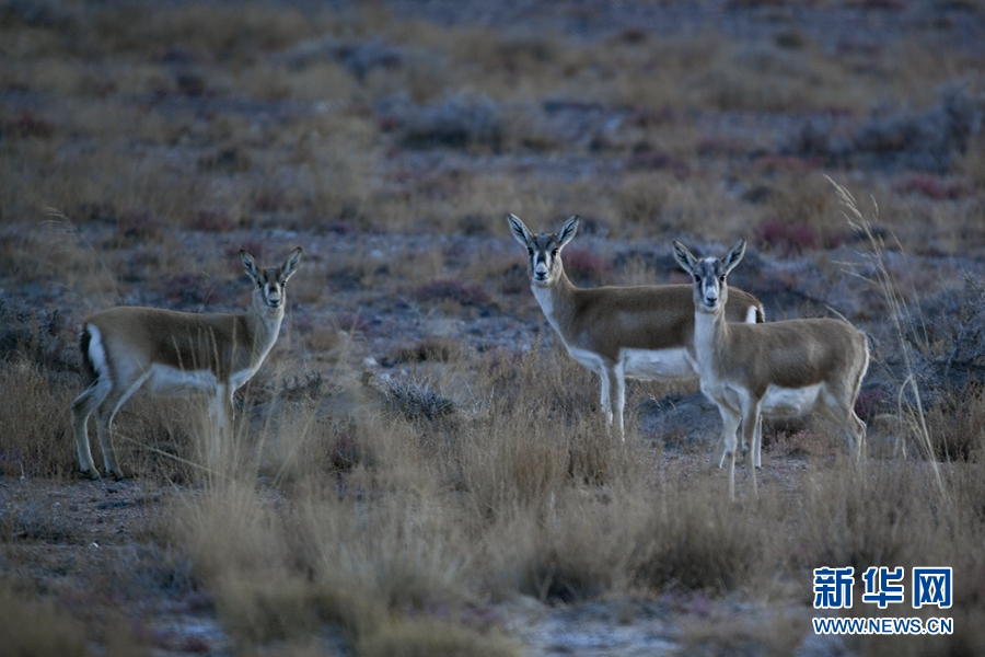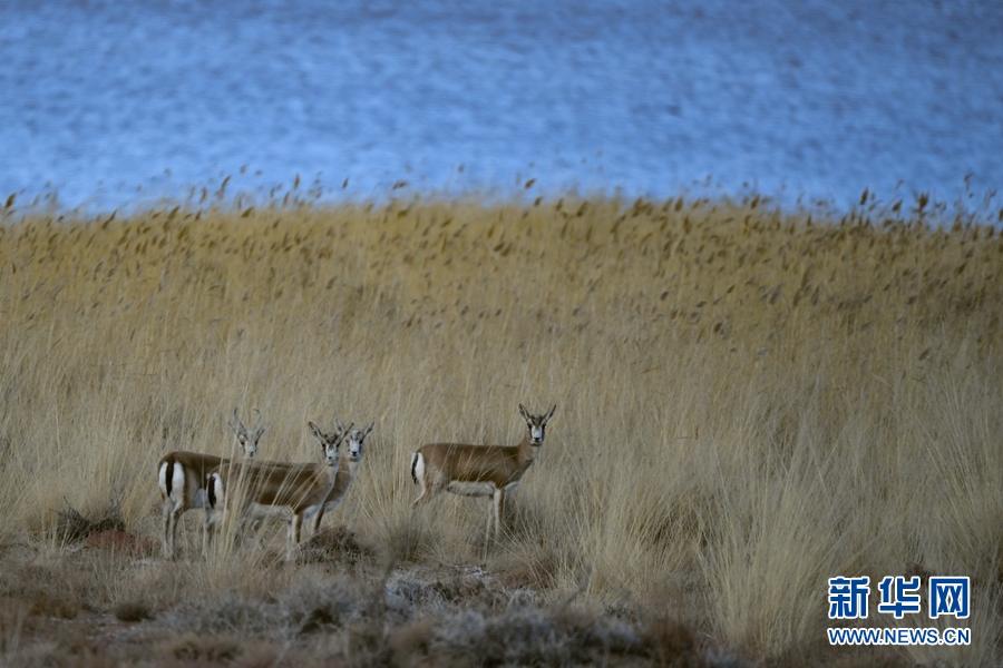 四只鵝喉羚在都蘭湖國家濕地公園內(nèi)活動。(11月21日攝)新華網(wǎng) 潘彬彬 攝