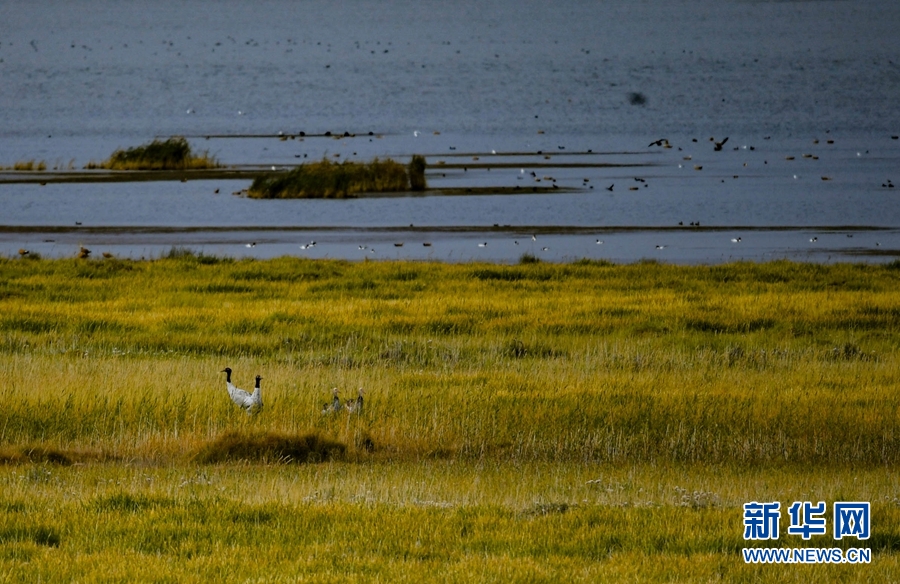 生活在都蘭湖國家濕地公園內(nèi)的黑頸鶴一家。(9月24日攝)新華網(wǎng) 潘彬彬 攝