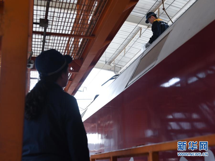 2月24日,在青藏鐵路公司西寧機務(wù)段整備車間,隔離開關(guān)班組成員賀霞(前)與王麗在工作中。新華社記者 張龍 攝