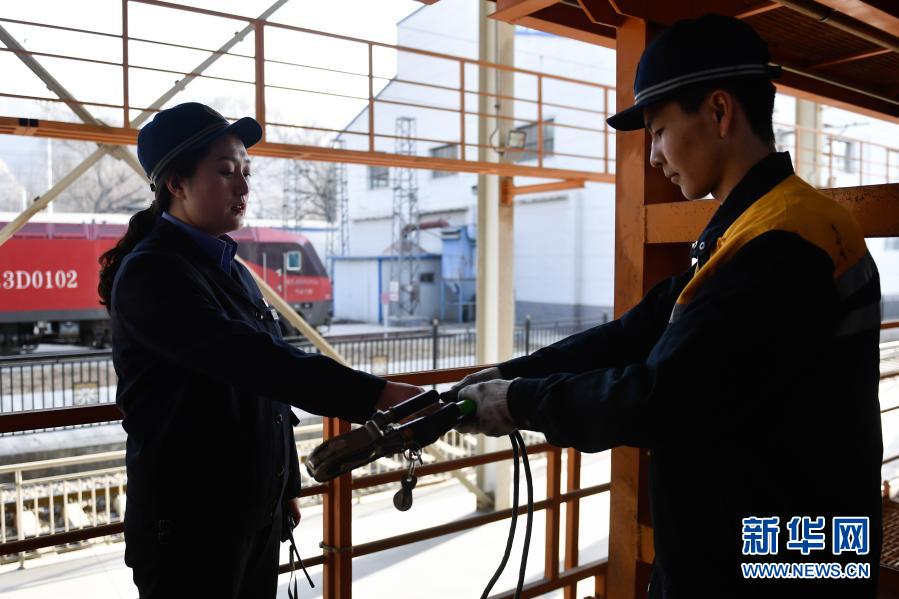 2月24日,在青藏鐵路公司西寧機務(wù)段整備車間,隔離開關(guān)班組成員賀霞(左)在工作中。新華社記者 張龍 攝