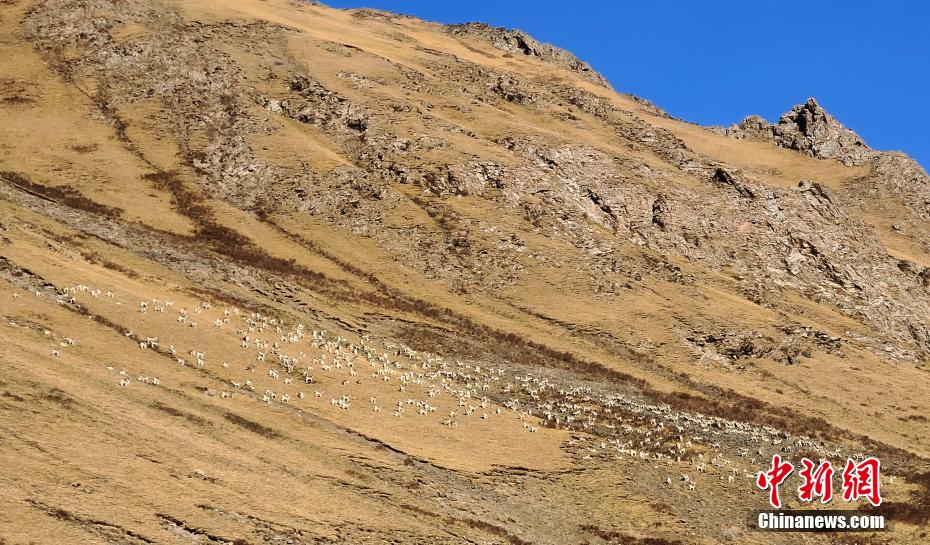 位于青海省南部的三江源區(qū)域,包括長(zhǎng)江源(可可西里)、黃河源、瀾滄江源,是青藏高原生態(tài)系統(tǒng)的典型代表,分布雪豹、藏羚羊、野牦牛、黑頸鶴等珍稀物種,被稱“高原野生動(dòng)物王國”、“高寒生物種質(zhì)資源庫”。圖為巖羊群。曲麻萊管理處 供圖