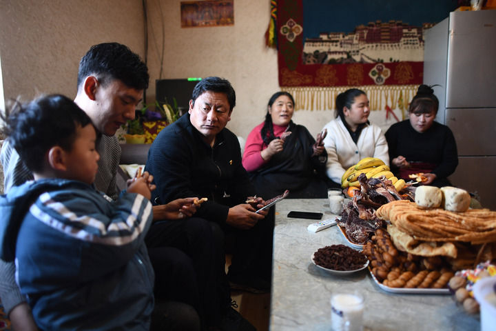 3月10日,尕瑪松保(左三)和家人在家中吃早飯。
