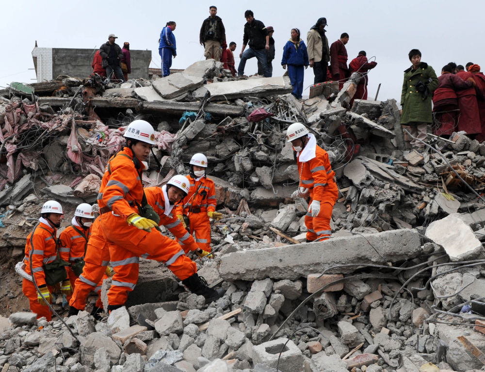 圖為2010年4月16日,救援隊(duì)員在結(jié)古鎮(zhèn)民族賓館廢墟上進(jìn)行搜救。