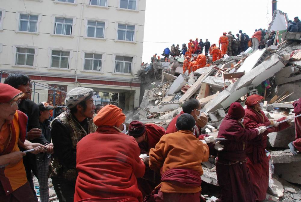圖為2010年4月16日,救援人員在結(jié)古寺賓館進(jìn)行救援。