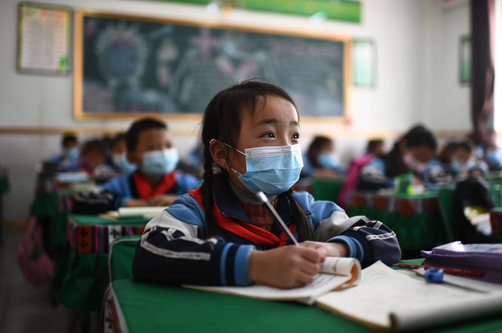 玉樹市第三完全小學(xué)二年級(jí)一班學(xué)生求永藏嘎在上課(2020年4月9日攝)。