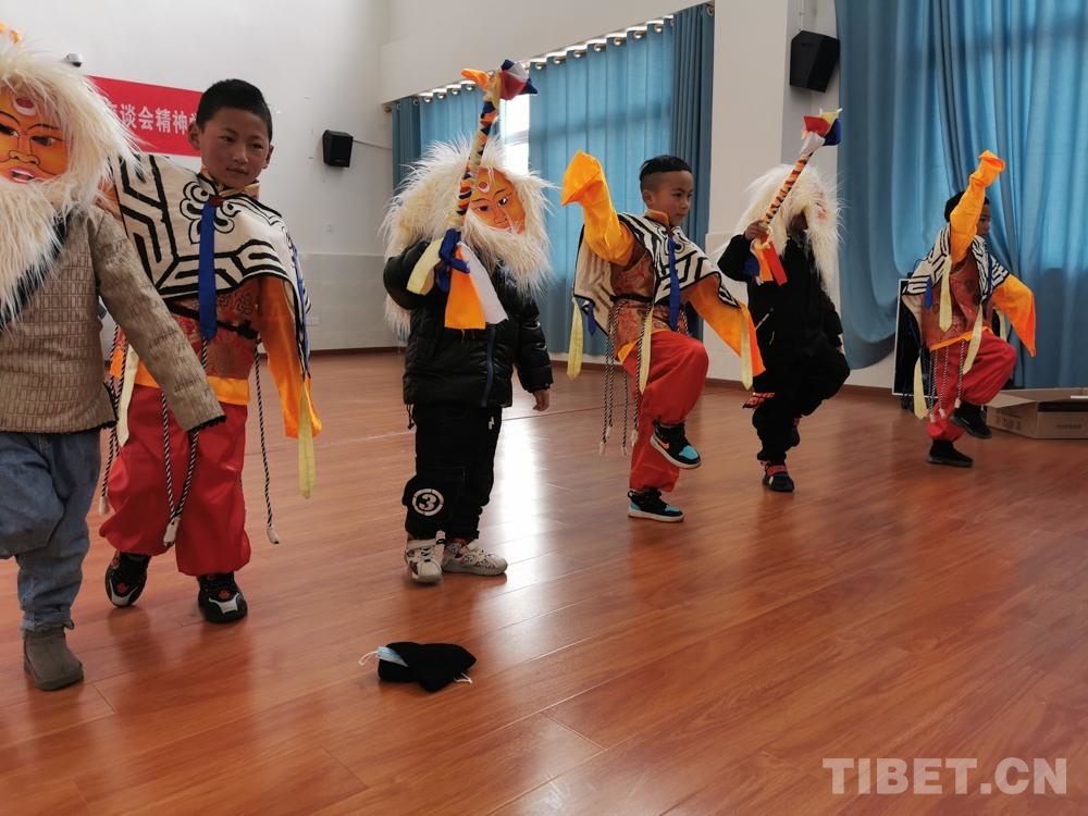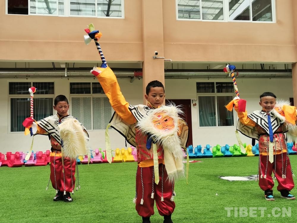 圖為高城鎮(zhèn)幼兒園的孩子們體驗藏戲游戲