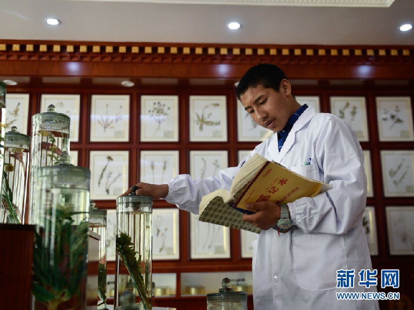 3月16日,在果洛藏族自治州職業(yè)技術(shù)學(xué)校,2020級(jí)藏醫(yī)醫(yī)療與藏藥專業(yè)學(xué)生華旦在草藥標(biāo)本館內(nèi)辨認(rèn)藥材。新華社記者 張龍 攝