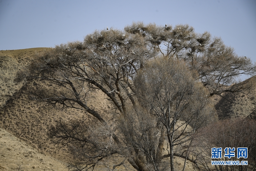 一群蒼鷺在貴德縣河東鄉(xiāng)的一棵百年楊樹上嬉戲。新華網(wǎng) 潘彬彬 攝