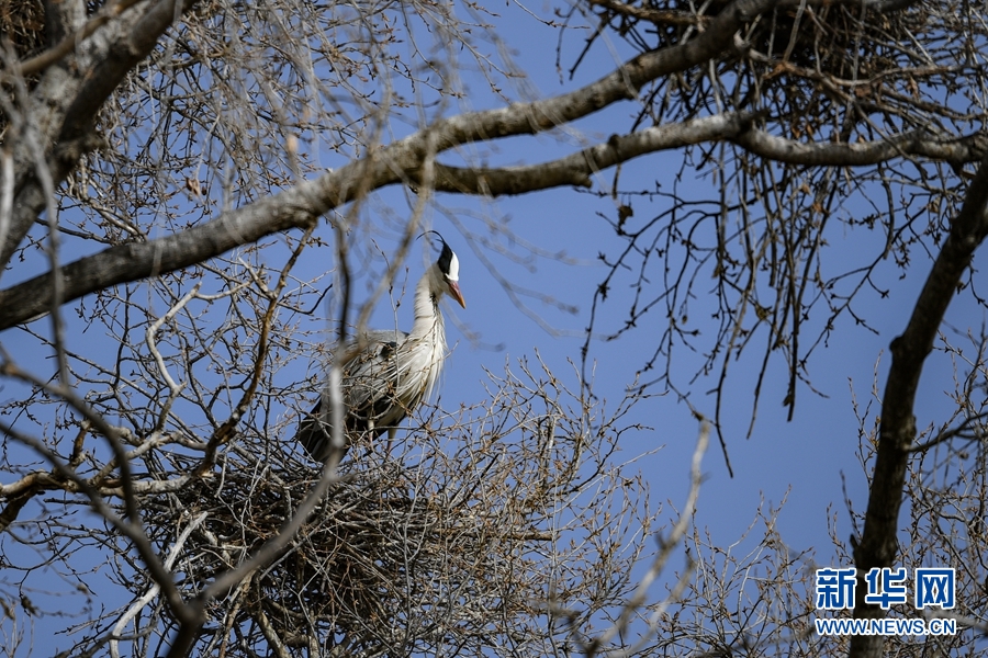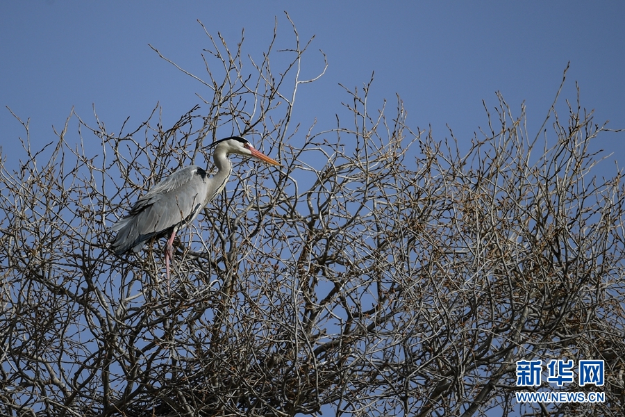 一只蒼鷺站在樹梢上享受春日暖陽。新華網(wǎng) 卡婭梅朵 攝