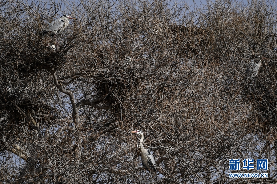 三只蒼鷺在樹梢嬉戲。新華網(wǎng) 潘彬彬 攝