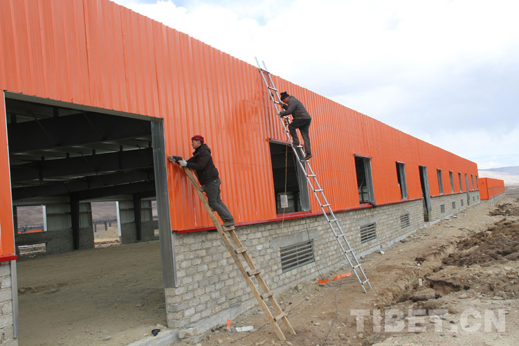 圖為工人給鋼構(gòu)牛棚墻瓦打螺絲