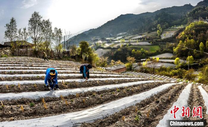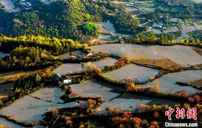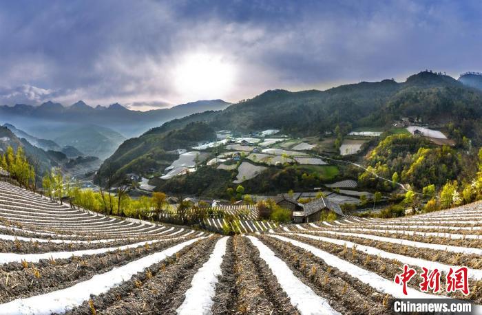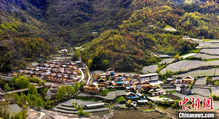 4月的四川雅安市寶興縣磽磧藏族鄉(xiāng),山坡上整齊有序的地膜,錯落有致鋪在藏寨林間,構成了一幅田園山水與天人合一的自然畫卷。
