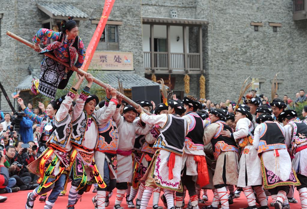 羌族同胞在四川省阿壩藏族羌族自治州理縣桃坪羌寨進(jìn)行推桿比賽。新華社 何海洋 攝