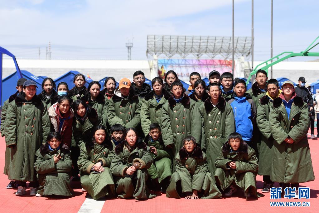 5月24日,曲邁卓瑪(左一)在瑪多縣民族寄宿制中學(xué)參加升旗儀式。新華社 張龍 攝