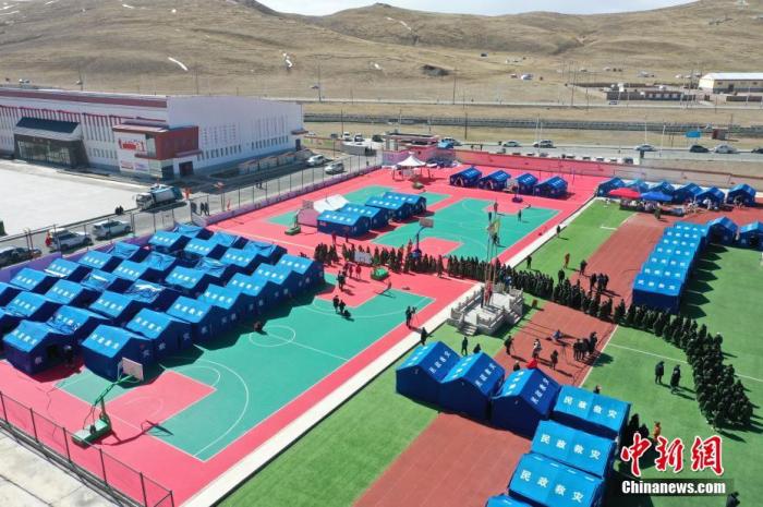 5月24日,瑪多縣民族寄宿制中學的師生們參加升旗儀式。當日,青海省果洛藏族自治州瑪多縣學生復課。(無人機照片) 中新社記者 馬銘言 攝
