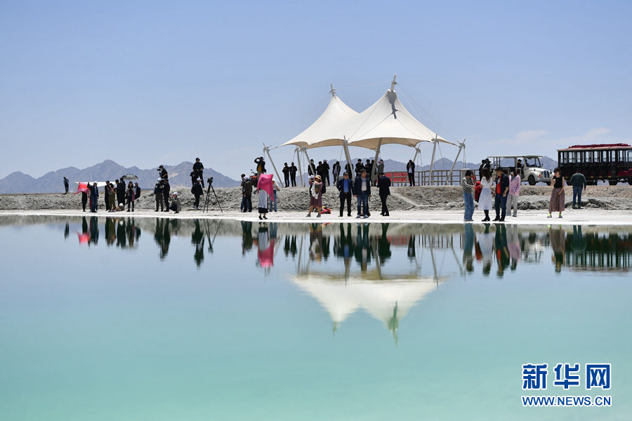 浙商們“打卡”位于大柴旦行政區(qū)境內(nèi)的翡翠湖。新華網(wǎng) 卡婭梅朵 攝