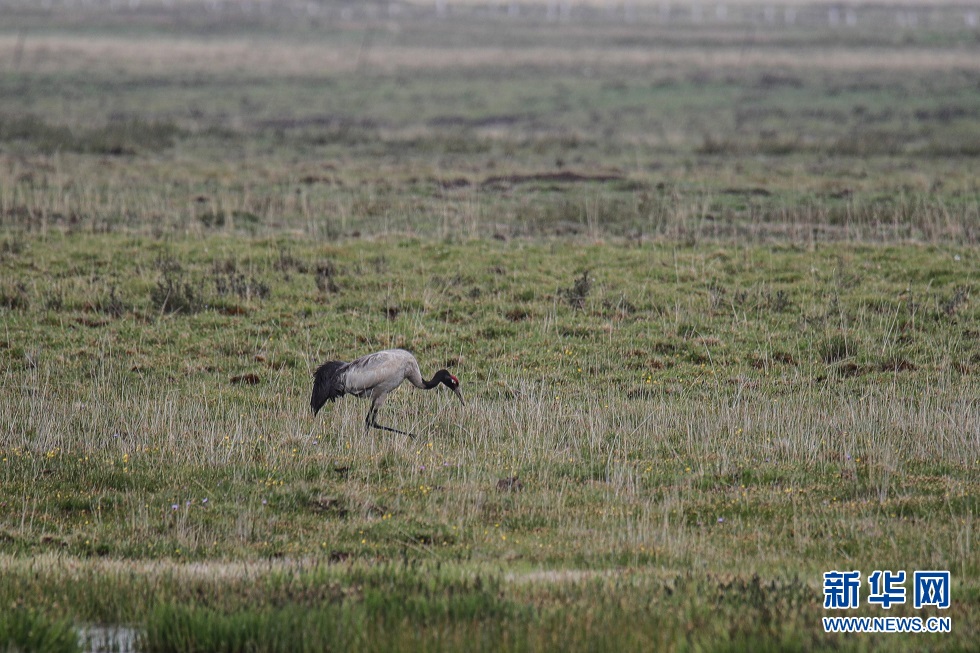 這是6月2日在甘肅省甘南藏族自治州碌曲縣尕海湖拍攝的國(guó)家一級(jí)保護(hù)動(dòng)物黑頸鶴。新華社記者 杜哲宇 攝