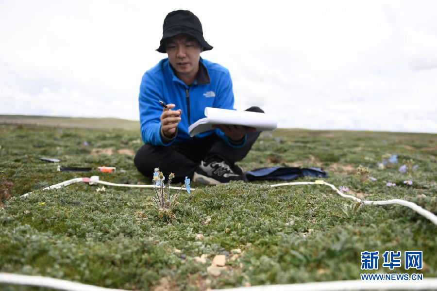 2021年長(zhǎng)江源綜合科考的科考隊(duì)員任斐鵬在長(zhǎng)江南源當(dāng)曲地區(qū)觀察高寒草甸(7月23日攝)。新華社記者 張龍 攝