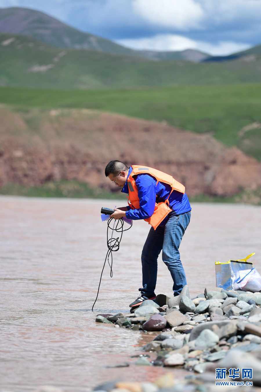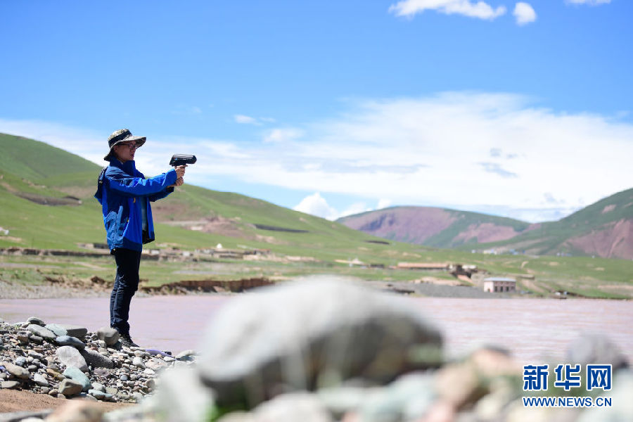 2021年長(zhǎng)江源綜合科考的科考隊(duì)員趙良元在通天河流域觀測(cè)水文(7月24日攝)。新華社記者 張龍 攝