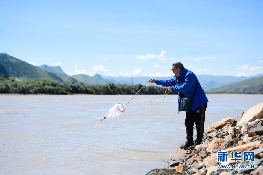 2021年長(zhǎng)江源綜合科考的科考隊(duì)員陳鵬在通天河流域觀測(cè)河流流速(7月24日攝)。新華社記者 張龍 攝